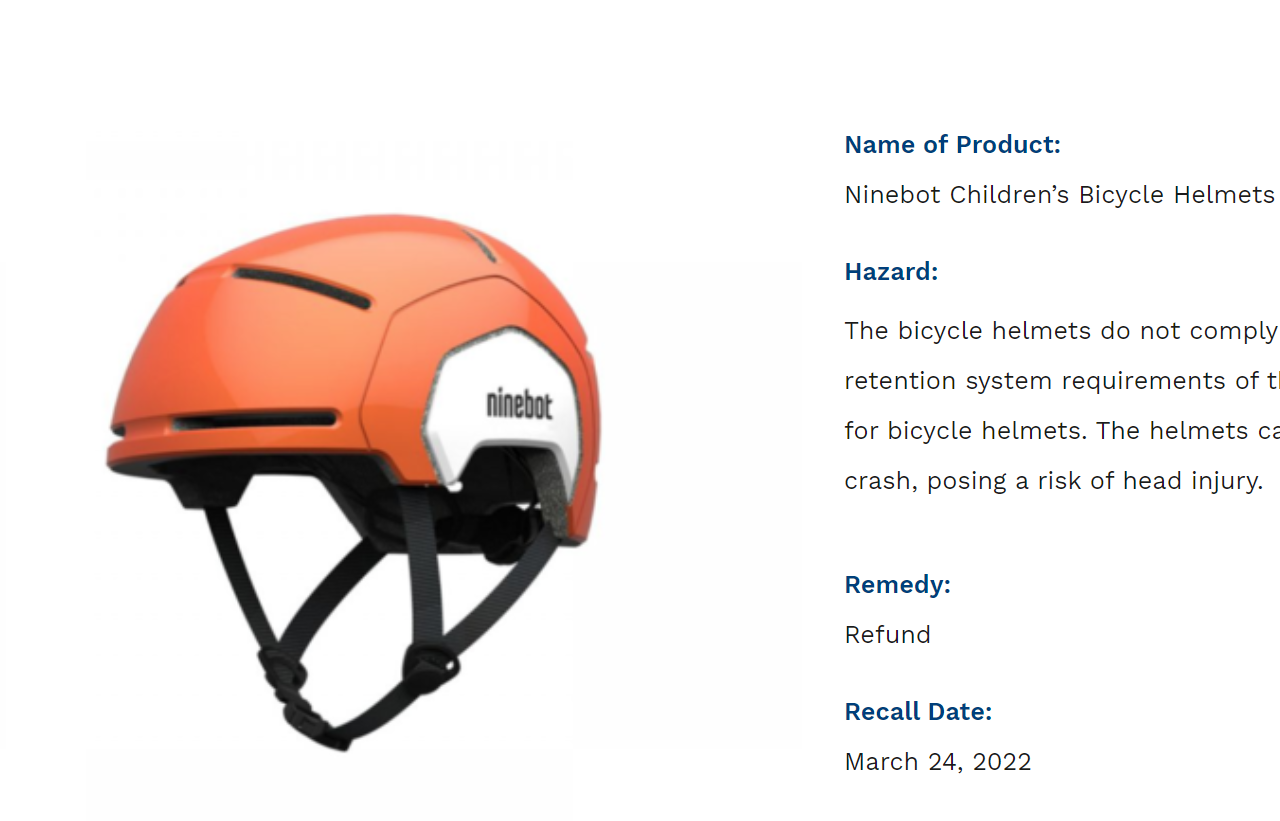 信息显示,美国安全委员会(CPSC)宣布召回Ninebot儿童自行车头盔。