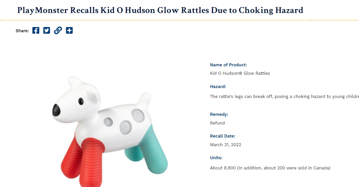 据称,这款牙胶名为KidO Hudson Glow摇铃,产自中国,形状像一只小狗,摇晃时会发出轻柔的嘎嘎声。长4 英寸,宽 2 英寸,高 3.8 英寸。