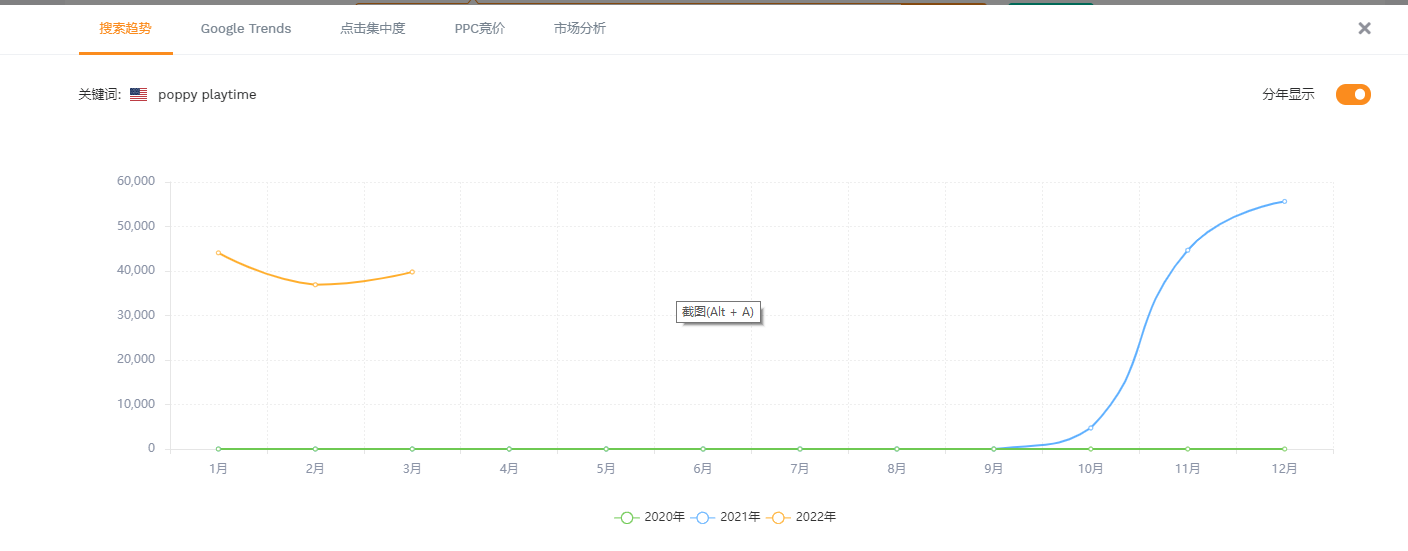 从2021年至2022年的搜索数据来看,2021年12月份的搜索量达到55236,是该款商品的搜索高峰期。