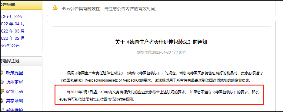 通知称,自2022年7月1日起,在eBay销售产品的卖家,必须遵守《德国包装法》的要求,否则,eBay将可能依法限制在德国市场的销售权限。