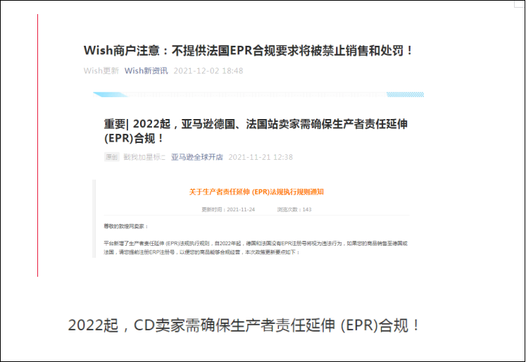 为了谨遵欧盟的EPR政策,从2022年1月份起,亚马逊、eBay、速卖通、敦煌网、Cdiscount,Wish等电商平台就陆续发布相关通知,要求符合要求的卖家注册EPR,并在规定的时间内上传EPR注册号,对于不符合相关规定的卖家,平台将会采取措施,停售相关商品。