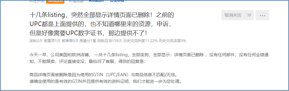 据了解,因UPC条形码致导Listing被删除的店铺并不是个例。