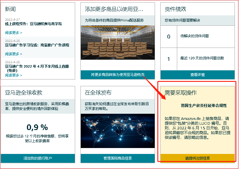 通知称,如果卖家在亚马逊德国站销售商品,需要提供“包装”分类的LUCID编号,否则,从2022年6月15日开始,亚马逊将屏蔽不合规的商品。