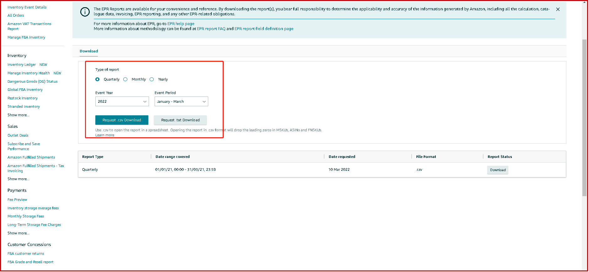 而在今年3月份的时候,为了让卖家进一步符合EPR的法规,亚马逊就发出相关通知,告知卖家,备案之后,可以下载报告以支付德法两国EPR类别的费用。报告类型分为月、季,年。