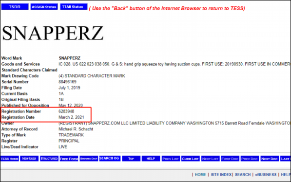 据检索发现,SNAPPERZ已于2021年3月份注册了美国商标。