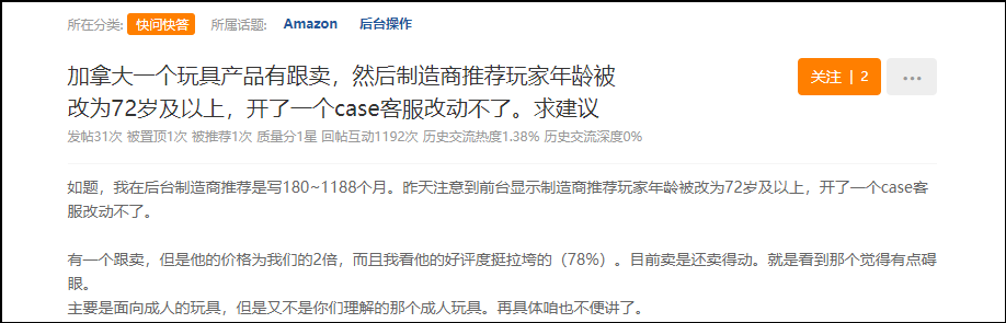 跟卖者除了listing跟卖之外,还肆意地利用VC账号自带的高级权限修改了listing,现已将其“玩家年龄改为72及以上”,直接将受害者该listing置于死地。