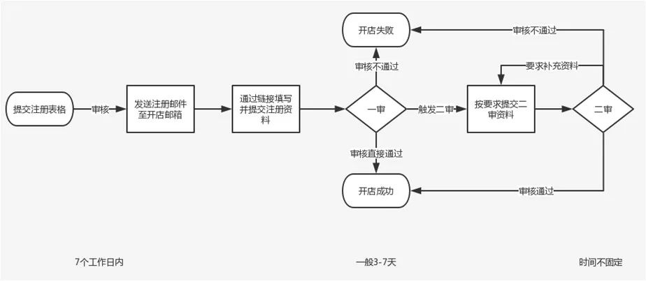 当然,以上北美开店流程是在一审通过后,没有触及到二审的情况下的注册时间,如果涉及到二审的话,开店时间是根据资料的再次确认而定。