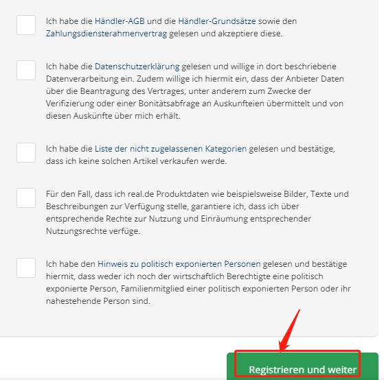 完成上面的步骤后就可以返回查看下自己之前所填写的信息是否有错误的地方,如果有的话记得改正,核对完成后即可点击页面右下角的按钮完成注册。Real.de工作人员在核实信息后会以邮件的方式通知你。