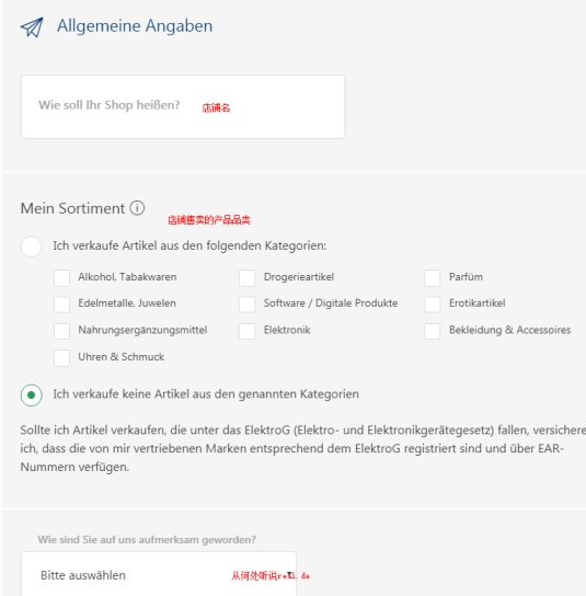 5.依次填写Real.de店铺名以及你即将入驻该平台的产品类目,后点击绿色按钮进行保存并继续下一步。
