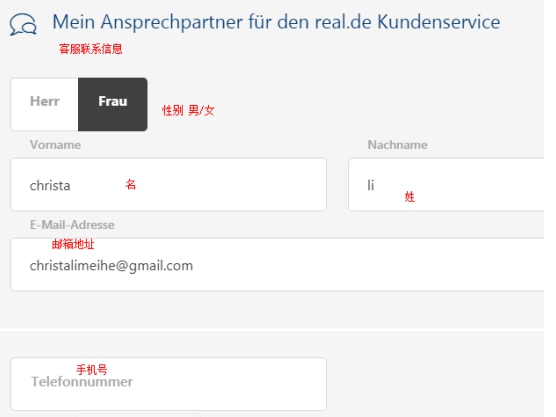 2.依次填写性别、姓名、电子邮箱以及Real.de账户登入密码