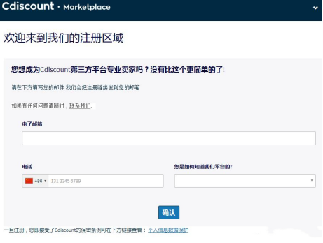 1.首先,找到注册链接https://marketplace-registration.cdiscount.com/,进入注册申请页面,输入注册邮箱,电话号码还有选择如何得知Cdiscount平台,之后点击确认如下图: