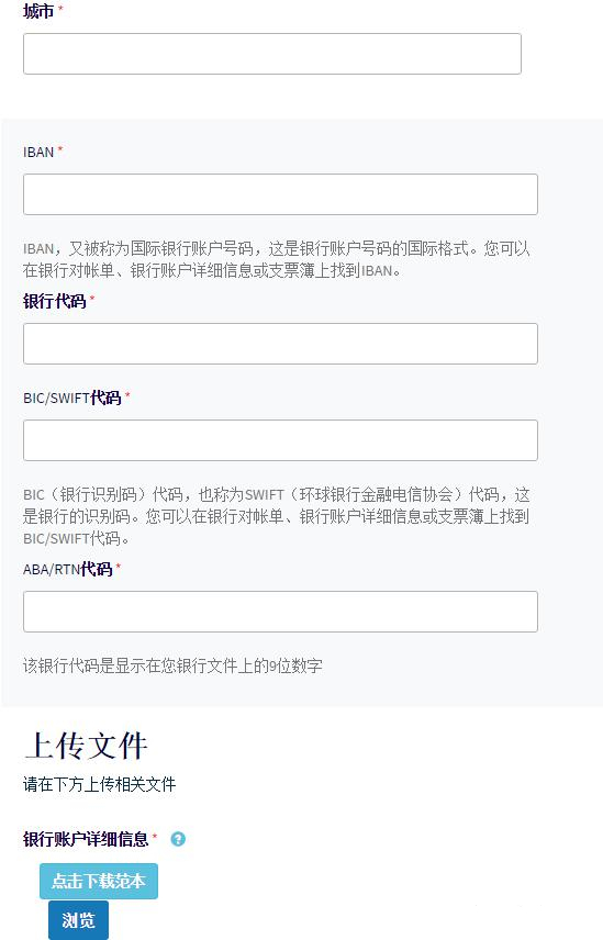 包括:收款账号的地区/国家,街道名字以及门牌号,邮编,城市,IBAN号码,银行代码,BIC/SWIFT代码以及 ABA/RTN代码