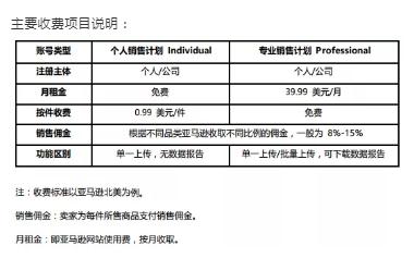 个人注册主体如果只申请个人销售计划,不用月租金,只按件收费,专业销售计划需支付39.99美元每个月的费用,销售佣金都是按不同比例的佣金,个人销售计划与专业销售计划在后台功能上也会有所差别。具体详细信息如下图:
