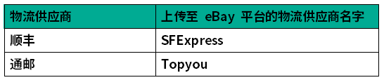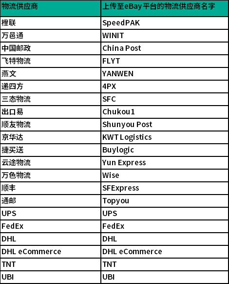 目前已经完成对接的中国大陆地区提供可追踪物流服务的承运商完整清单如下,请卖家在回传包裹跟踪号时,根据以下列表填写承运商信息,以使得eBay能够准确获取到追踪信息: