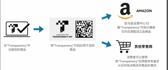 透明计划的产品会被贴上“透明二维码(Transparency code)”,一个唯一的蓝色二维码标签,这个二维码标签会对应到参加透明计划的SKU上。顾客只需要使用亚马逊的Transparency app应用扫描产品外包装上的二维码,马上就能知道产品的真实性以及从生产到销售的整个过程包含的信息。