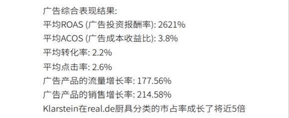 在real.de中,卖家可以选择各种市场促销活动来增加产品曝光率。其中,SPA关键字广告以其超高的性价比而受到许多卖家的欢迎。 SPA广告是点击型广告,可以有效提高产品在相关搜索页面上的展示率。许多卖家使用SPA广告来提高产品转化率,并提高其在real.de上的自然搜索排名和市场份额。值得一提的是,SPA广告在主打品牌路线上尤其受卖家欢迎,这可以极大地帮助提高品牌知名度并增加整个商店的销售额。以下是一些经典案例供您参考。