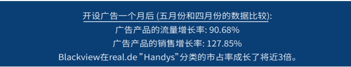 Blackview为他们的上市产品于4月初制作了SPA广告。使用了一个月的广告后,产品的流量和销售量都大大增加了。即使在5月份,整个平台手机整体的销量下降了14.17%,Blackview的产品销量仍显示出增长趋势,,市场份额增长了近三倍。