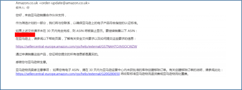 邮件称,作为筛选计划的一部分,确保电子产品符合指定的认证标准,卖家须在30天内提供相关文件,否则ASIN将禁止显示。