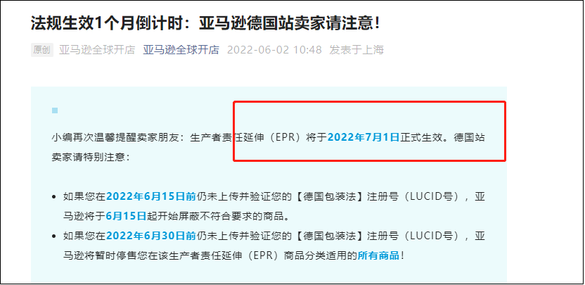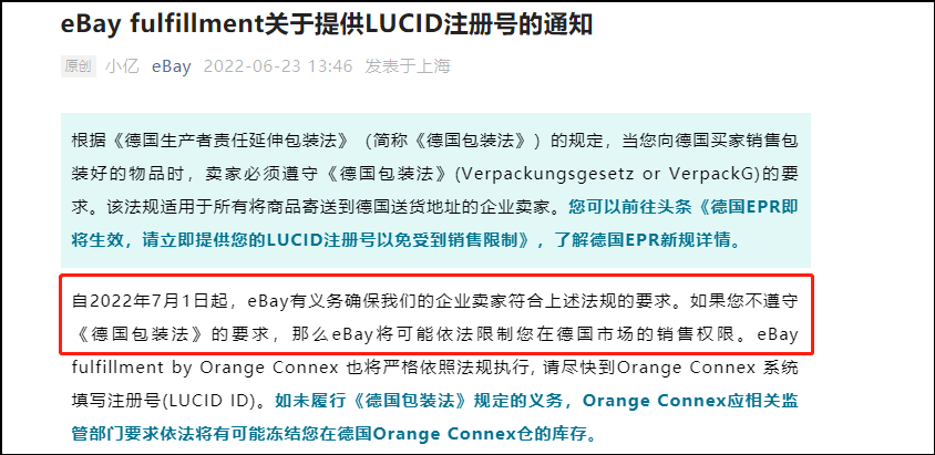 同时,无论是亚马逊,还是eBay平台已在公众号连续发布了卖家须在规定的时间遵守包装法的要求。