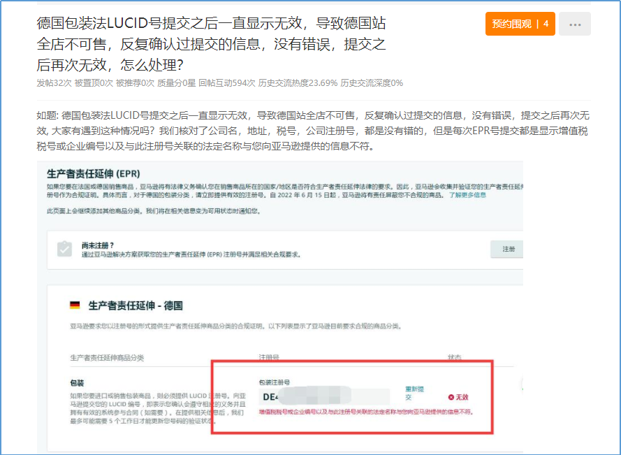 “德国包装法LUCID号提交之后一直显示无效,导致德国站全店不可售。”