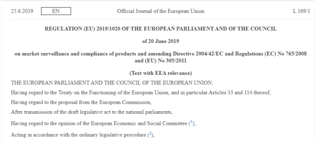 2019年6月20日,欧盟议会和理事会批准了一项新的欧盟法规EU2019/1020。该法规主要规定CE 标识的要求、公告机构(NB)和市场监管机构的指定和运作规范。它修订了2004/42/EC 指令、(EC) 765/2008指令及(EU)305/2011法规。