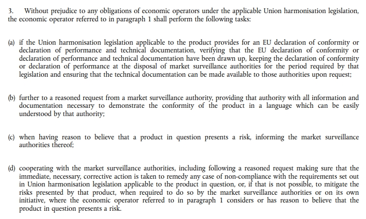 4、与市场监督机构合作,遵守欧盟的要求,当产品出现问题时,确保立即采取必要的纠错措施,以纠正任何不符合规定的产品,若不采取进一步措施,市场监督部门有权要求或主动采取措施,以降低该产品带来的风险,经济经营者应全力配合。