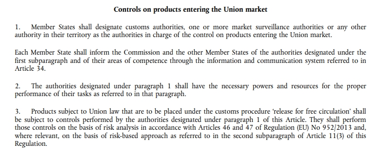 1. 欧盟各个成员国应指定其领土内的海关当局,为负责控制进入联盟市场的产品进行审查。每个成员国应通过指定的信息和通信系统,通知欧盟委员会和其他会员国。