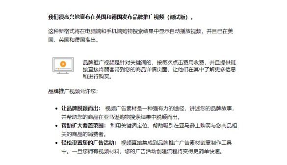 亚马逊刚宣布“黑色星期五”促销活动将于2020年10月26开始不久后,亚马逊再向英国与德国站卖宣布,英国与德国站也可以发布品牌推广视频。(如下图)。