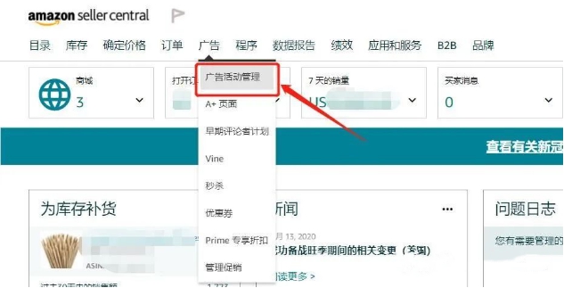 1. 登录卖家后台,选择“广告”,点击展开的“广告活动管理”创建广告系列。