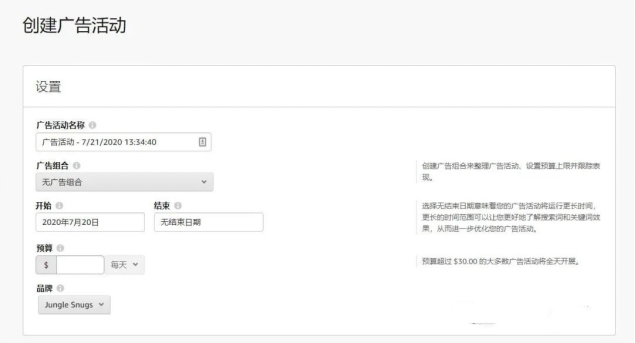 3. 填写“创建广告系列”页面“设置”部分中的信息