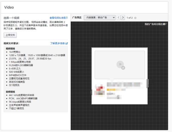 根据视频规格,制作视频之后,点击“上传文件”按键即可,如果你想看看效果,可以在“广告预览”那里浏览效果。