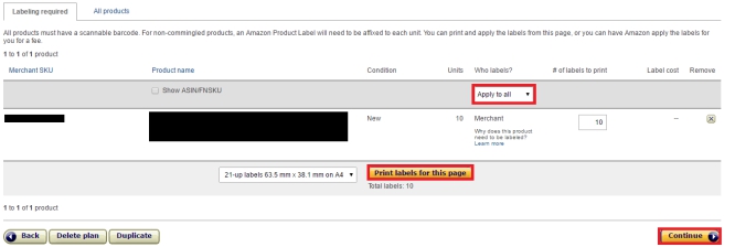 您现在要为产品贴上标签,有两种选择。如果您有标签打印机,则可以在家中自己做。如果没有,亚马逊将为您执行此操作,但是, 将收取费用。接下来,点击“为此页面打印标签”,然后按照此视频中的说明进行操作