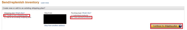 当您到达下一个界面的时候,选择“创建新的运输计划”选项以及“包装成箱的产品”,当向同一产品发送多个单位的同一产品时需要使用该选项亚马逊。点击“继续运输计划”,进入下一步。