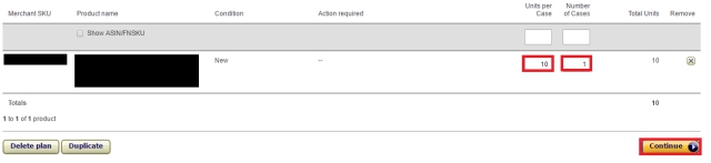 在下一个界面上,将为您提供输入要发送到亚马逊的单位和数量的选项,例如,如果您要在一个框中发送10个样本,则需要在其中输入10。在“每箱数量”框中,将数字1放入“箱数”框中,然后点击“继续”。(如下图)
