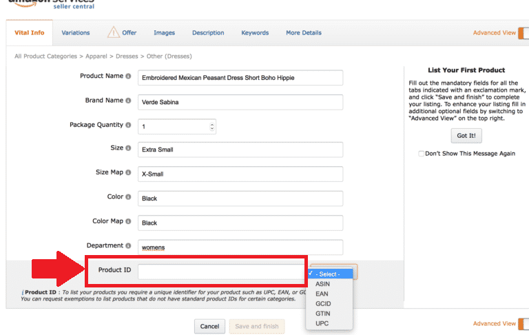 您可以直接从亚马逊购买UPC代码,方法是转到产品的“产品ID”部分,然后从下拉菜单中选择“ UPC”。 或者,您可以要求亚马逊提供豁免,因此您无需填写此选项。