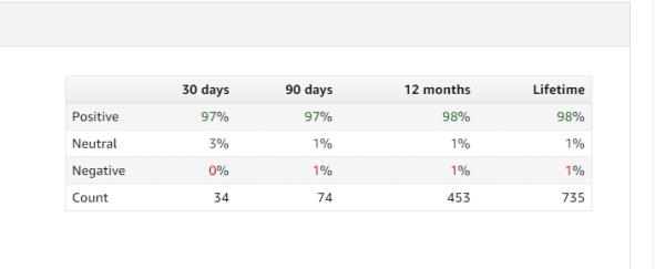 至于卖家的反馈,评估是根据30天,90天,12个月或寿命来计算的。计算方法如下: