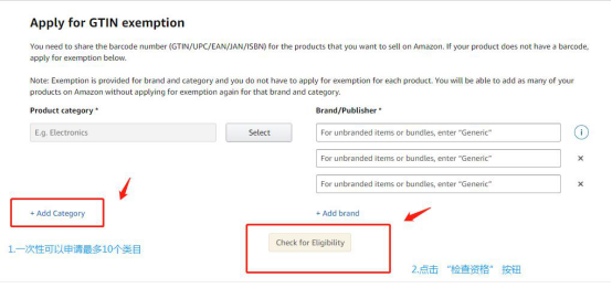 2.在这个界面填上“品牌的对用类目”并且输入你的英文品牌名,如果要一次性添加多个类目,可以点击“Add Category“,这里一次性可以申请最多10个类目;点击“检查资格”按钮就可以申请UPC豁免了。