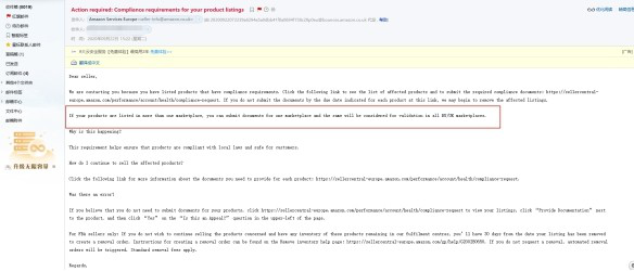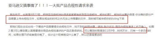 该卖家还强调了时限是在今年11月9日上传需要的文件,要不到时候Listing就会下架。除了这些,这位卖家还贴出了亚马逊给他发的邮件: