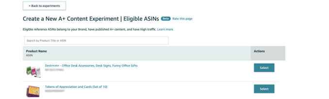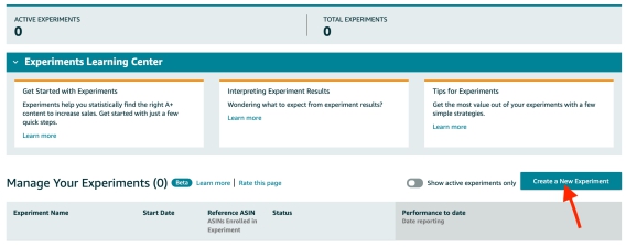 1.进入亚马逊卖家后台,可以看到“Manage Your Experiments”,在这里,点击创建一个“Create a New Experiment””看看你的哪个ASINs是合格的,(如下图)。