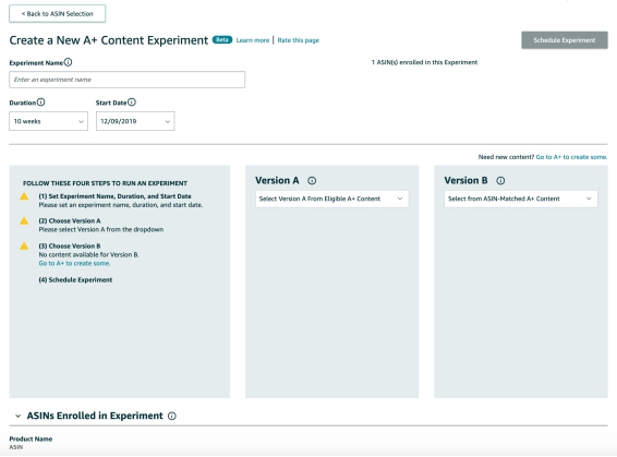 为”VERSION A“与“VERSION B”命名,设置持续时间和开始日期。然后提交版本A和B以获得同一ASIN的批准,两项都获得批准后,您就可以进行亚马逊A+页面A / B内容测试了。