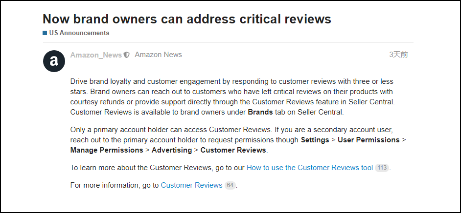 此外,我们可以看出,亚马逊开放此功能能够给品牌卖家与买家一个共同沟通协商的机会,让品牌卖家避免因评价的原因影响排名与转化率,从而减少品牌卖家的运营成本。