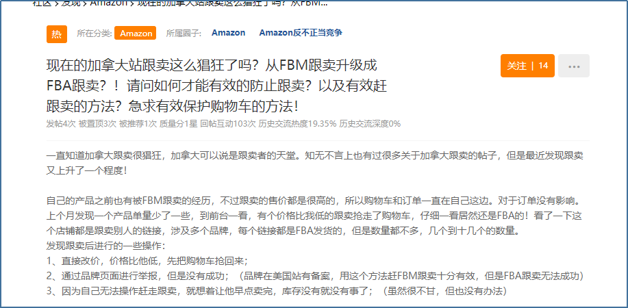 这是一位加拿大卖家吐槽加拿大跟卖的帖子。