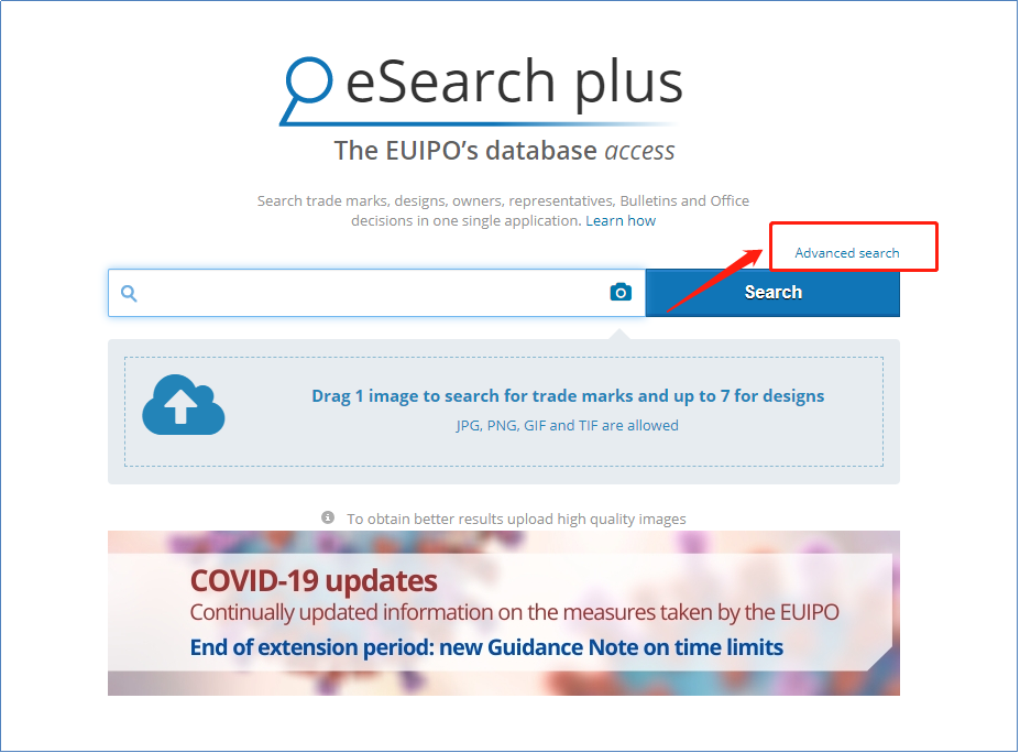 1.打开欧盟外观专利查询网址(https://euipo.europa.eu/eSearch/),进入欧盟外观专利查询官网,点击“ Advanced search”。