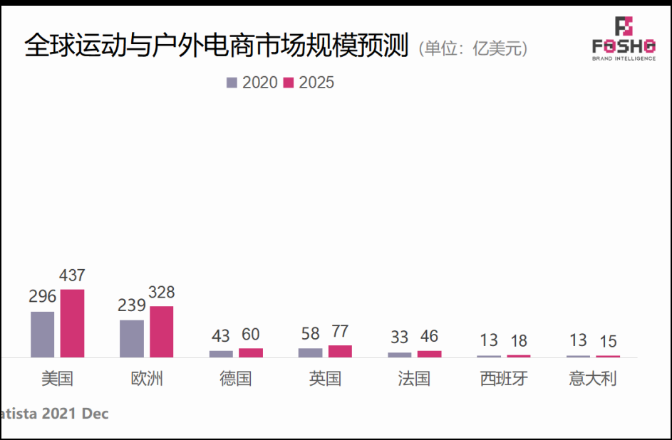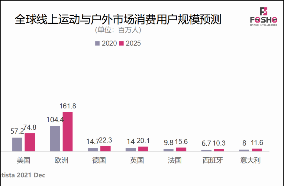 据业内调查显示,预估到2025年,美国运动&户外线上消费用户达7480 万,欧洲预计可达到 1.618 亿,所以,运动&户外用品将在海外市场持续增长。
