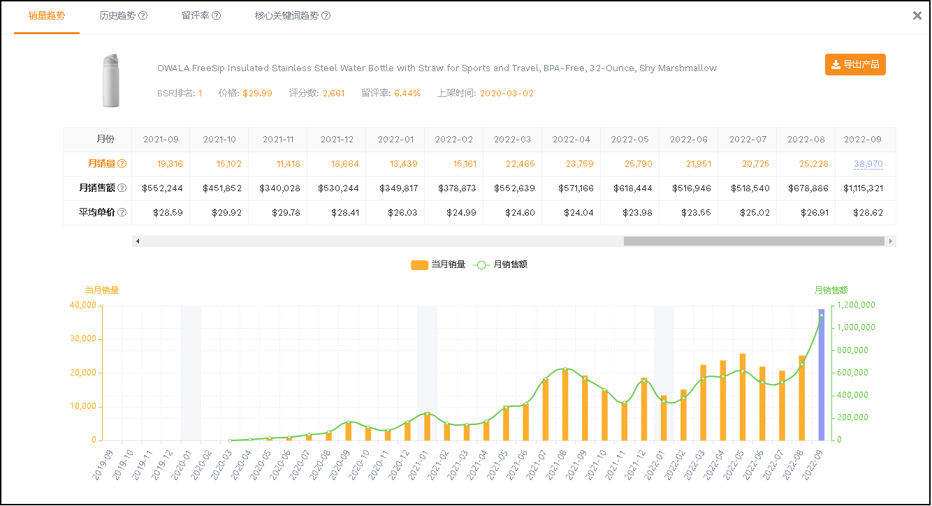 通过软件数据搜索显示,该款水杯首登亚马逊店铺是在2020 年 3月份,平均客单价可达到25美元,8月份与9月份都有增长的趋势。8月份销量达到26228,预估9月份销量可达到38970个左右。