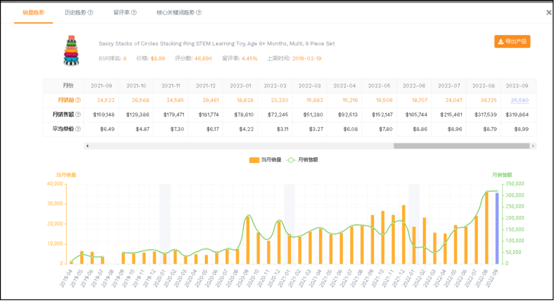 通过数据,我们了解到,该玩具上架于2019年2月19日,8月份销售额达到36126套,预计9月份销售额可以达到319864套,平均客单价是8.64美元。好评率达到4.8,评论46744,在亚马逊儿童玩具排在第8名。