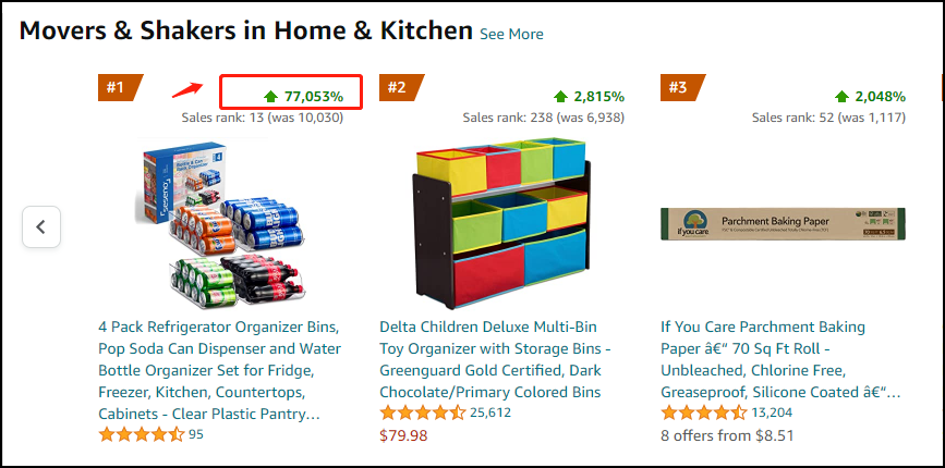 而在最近,在亚马逊美国站有一款“冰箱收纳盒”飙升到厨房家居排行榜第一名。