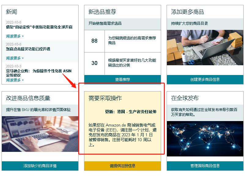 通知称,如果卖家在商城销售电气或电子设备,请提供德国WEEE注册信息避免卖家发布的商品在2023年1月1日被暂停销售。