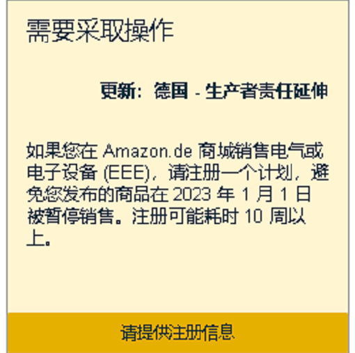 最近,亚马逊后台通知称,如果卖家在商城销售电气或电子设备,请上传德国WEEE注册信息,避免卖家发布的商品在2023年1月1日被暂停销售。