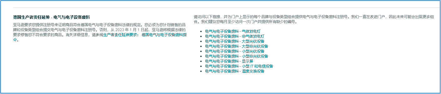 1. 前往卖家平台的“生产者责任延伸要求-德国电气电子设备指令”( https://sellercentral-europe.amazon.com/help/hub/reference/GY97WLQDLFH2SNBY)帮助页面,查看每种设备类型的合规门户链接。